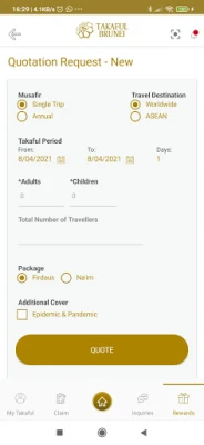 Takaful Brunei Mobile provides an easy and convenient platform to get quotations, renewals and information on selected Takaful Brunei Am Sdn Bhd (TBA) and Takaful Brunei Keluarga Sdn Bhd (TBK) products through your phone or tablets.