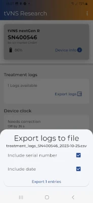 - Export the treatment logs saved in the device as a CSV file for analysis.